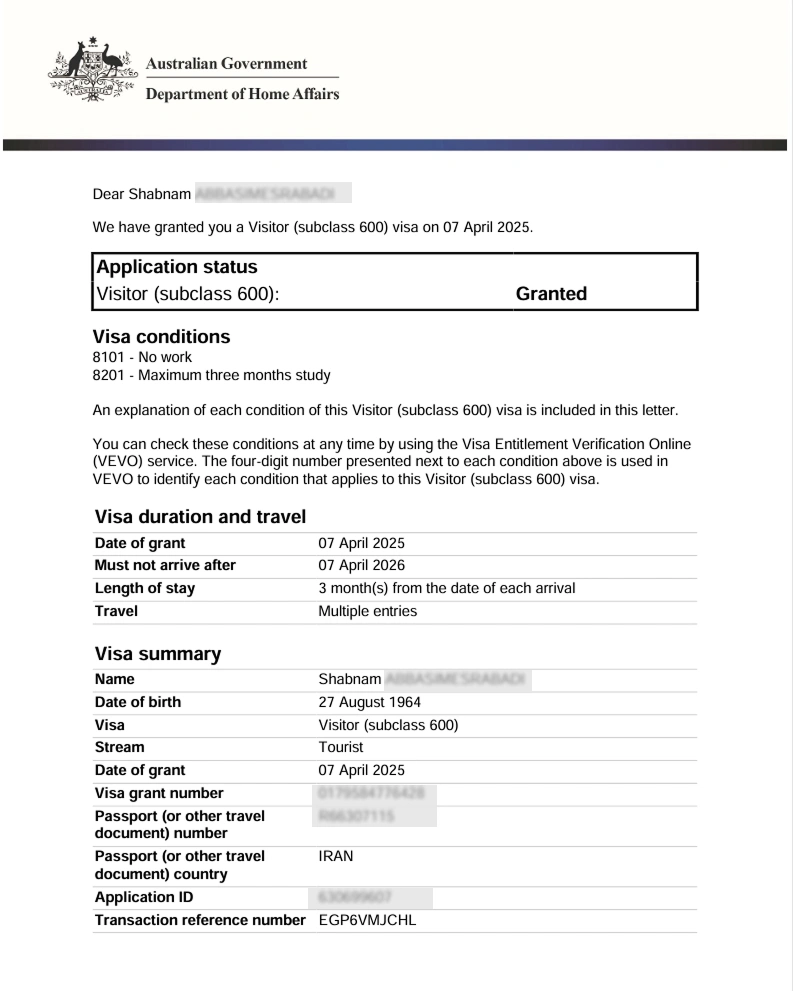 در صورت موافقت، ویزای گردشگری صادر شده و سفر امکانپذیر میشود. پس از رسیدن به استرالیا، تکمیل کارت مسافری ورودی (Incoming Passenger Card) در مرز الزامی است.